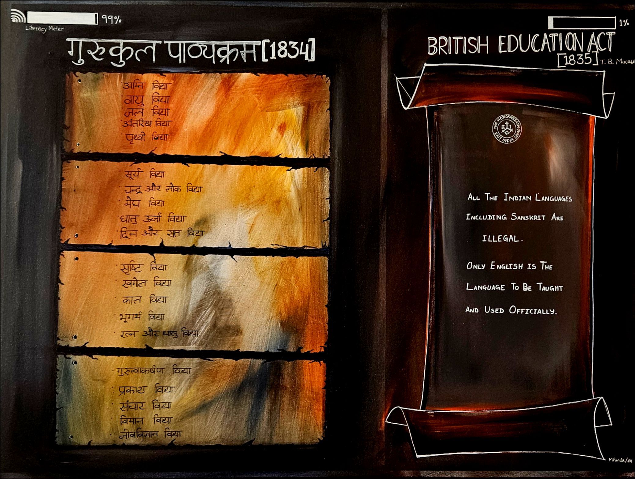 In this artwork, I have tried to captures the essence of the originality, highlighting the dramatic shift in how knowledge and literacy were perceived and measured under colonial rule. It’s thought-provoking and invites the viewer to reflect on following few pointers.